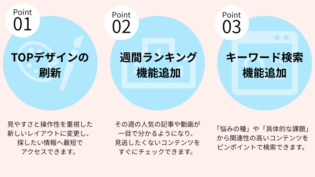 会員さまからのご意見を真摯に受け止め、「目的の情報にすぐアクセスできる」サイトを目指し、今回のリニューアルを決定いたしました。