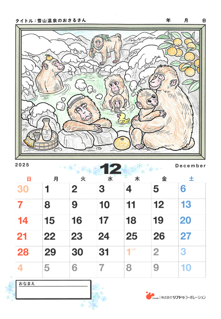 - 【カレンダーぬりえ】雪山温泉のおさるさん