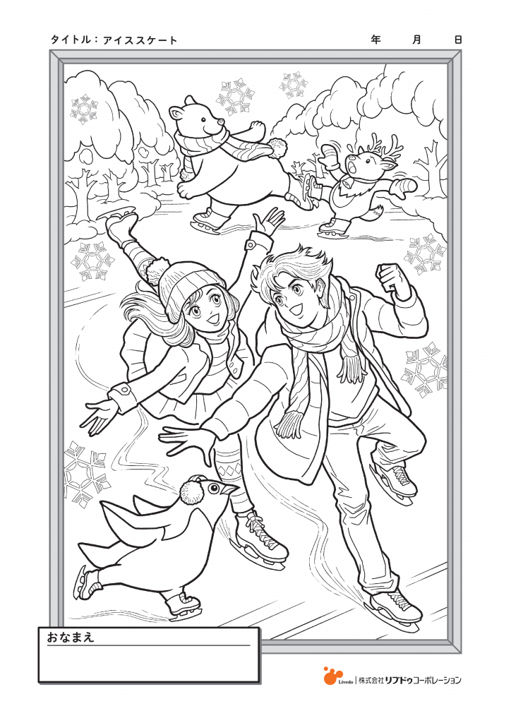 木々に囲まれた氷のリンクで動物たちと人間が楽しげに滑るぬりえです。