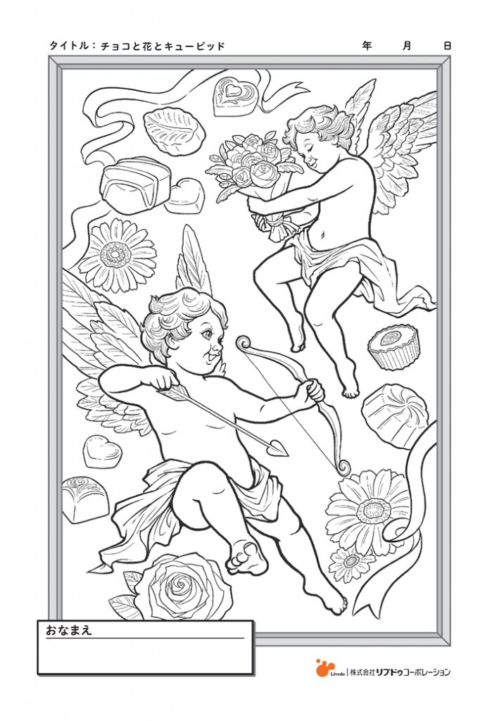チョコと花に囲まれたキューピッドがバレンタインの世界を彩るぬりえです。