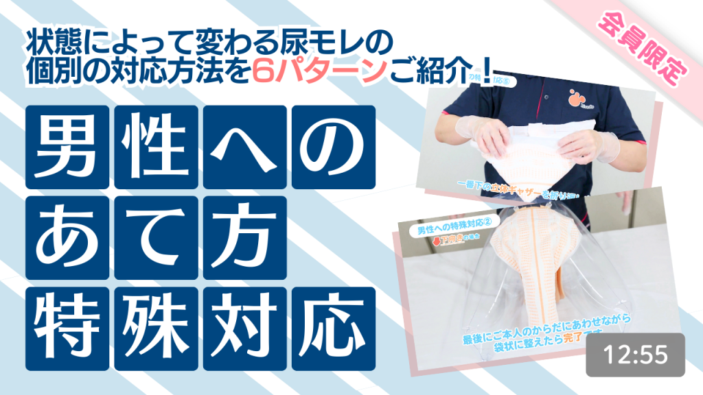 【男性へのあて方特殊対応】動画の資料です。男性へのパッドのあて方を実践する際に、印刷しておくとすぐに見返せるので便利です。